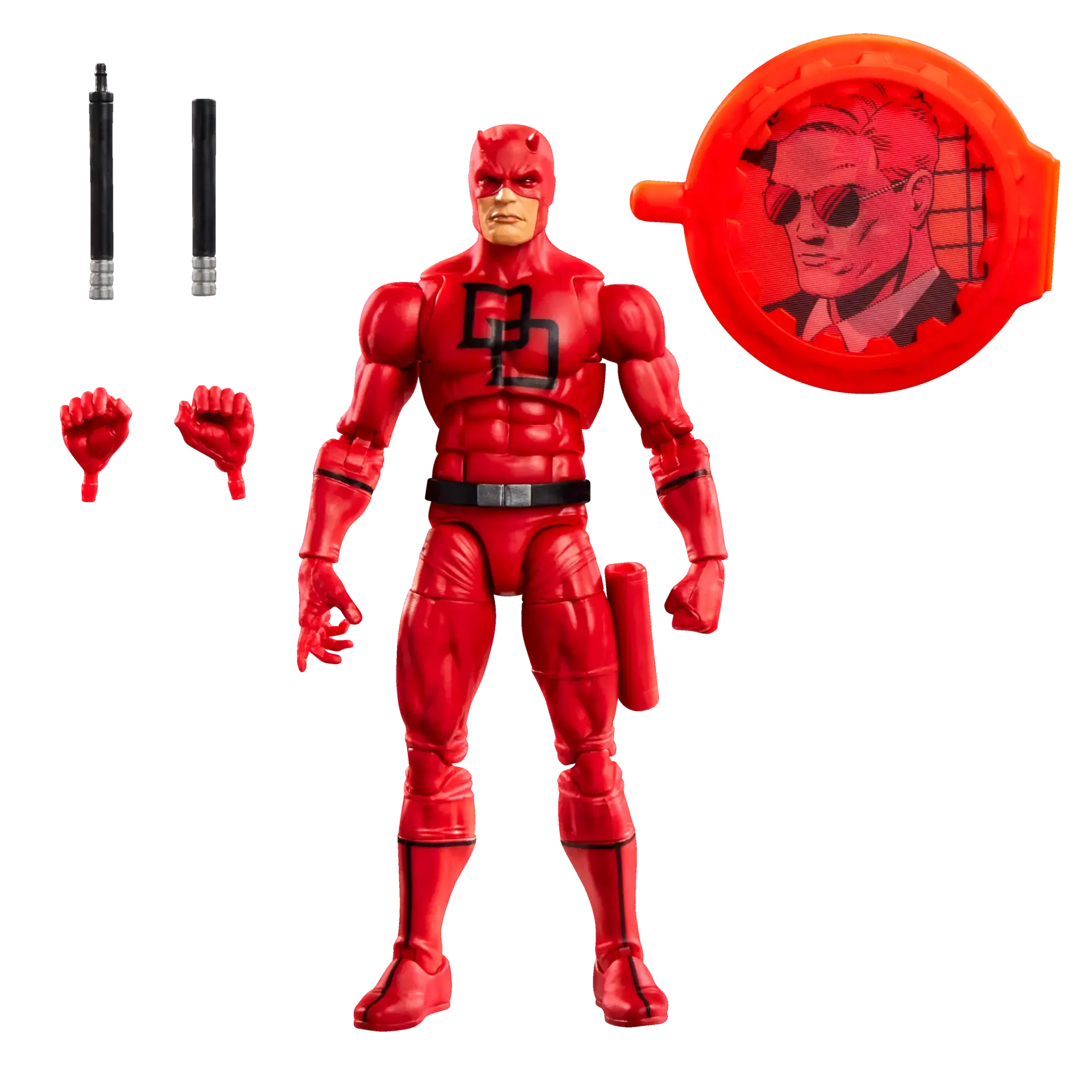 Featuring comic-inspired design and deco, it includes two alternate hands, a cane and baton that detach and attach to connectors, a cable and radar effect, and a "secret" lenticular shield inspired by the original figure.